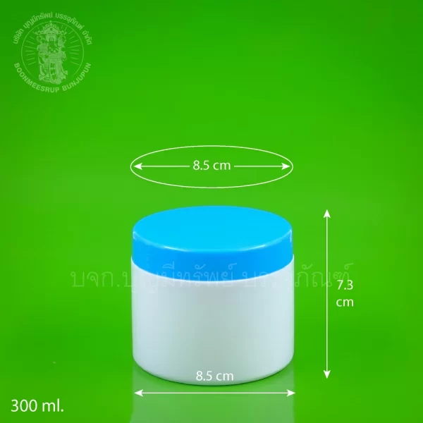 กระบอกพลาสติก สีขาวทึบ ฝาเกลียวฟ้า 300 ml.